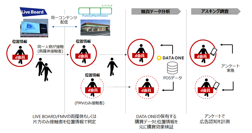 株式会社ゲート・ワン(住所:東京都港区、代表取締役社長CEO:藏田 一郎 以下、ゲート・ワン)は、株式会社データ・ワン(住所:東京都千代田区、代表取締役社長:太田英利 以下、データ・ワン)、株式会社 LIVE BOARD(住所:東京都渋谷区、代表取締役社長 櫻井 順 以下、LIVE BOARD)と共同で、LIVE BOARDが運営するデジタルOOH※1と、ゲート・ワンが運営するFamilyMartVisionにおいて、同期間に同一コンテンツを配信し、それぞれの広告接触者に対するアスキング調査並びにデータ・ワン保有の株式会社ファミリーマートの購買データおよび株式会社NTTドコモが保有するデータを用いた購買効果検証を目的とした実証実験を開始しました。