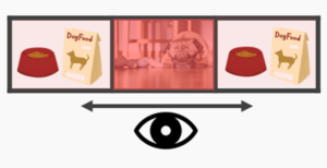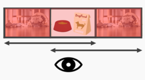 真ん中動画/左右静止画は、視線の多くが真ん中の動画に集中します。静止画に視線が動くこともありますが、その視線の量はかなり少なくなります(下図c)。