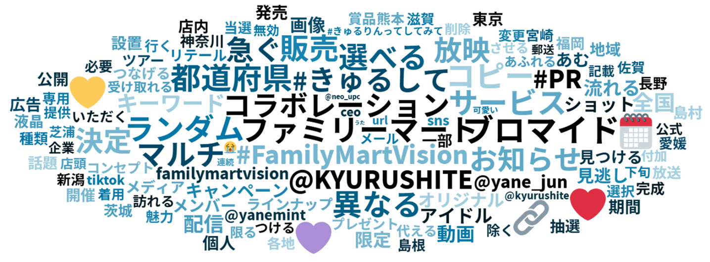 コラボキャンペーン期間中、SNS上では「#きゅるりんってしてみて」「#FamilyMartVision」のハッシュタグ付き投稿が多数確認され、ファンによるファミリーマート店舗への訪問の様子や動画視聴の感想が活発に共有されるなど、Xを中心に3,300件以上※の投稿がみられました。特に、都道府県別で異なるオリジナル動画の配信については「自分の住んでいる地域の動画は○○(曲名、メンバー)だった!」という発見や、全種類コンプリートするために色々な県のファン同士でキーワードを共有し合うなど、地域性を活かしたSNSならではの反響が得られました。また、「見に行かなきゃ!」「期間中はファミマ通います」など、店舗への来店の動機にもつながる投稿も多くみられました。