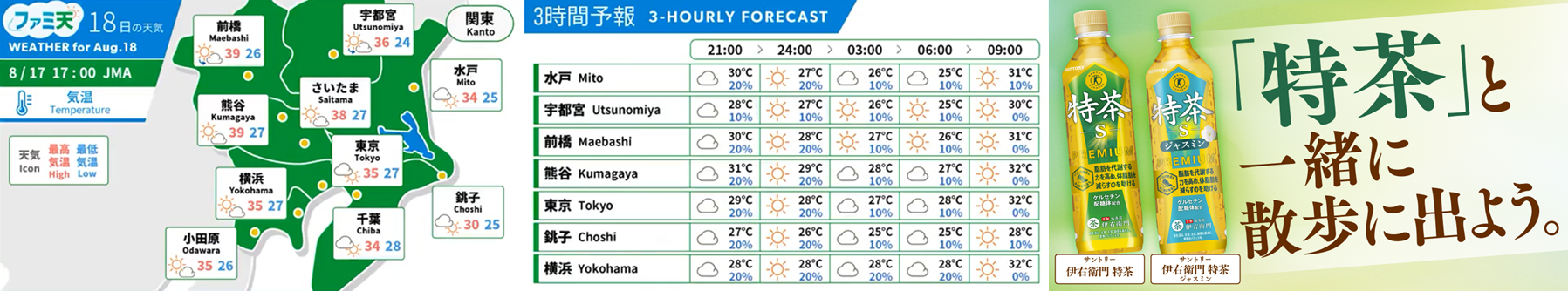 このたび、サントリー食品インターナショナル株式会社(本社:東京都港区、代表取締役社長:小野 真紀子)のご協力のもと、気象情報番組「ファミ天」(以下、当番組)をさらにアップデートし、気象情報と連動した新広告メニューの実証実験を2025年10月28日(火)から2025年11月10日(月)まで実施いたします。