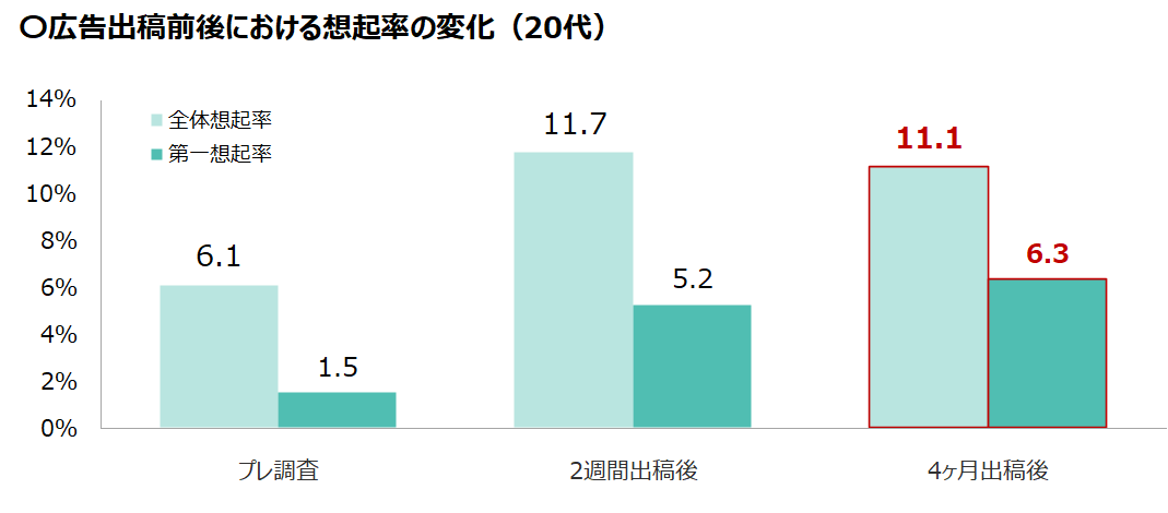 検証の結果、継続出稿により当該カテゴリー内における純粋想起※1、ならびに第一想起※2が上昇することが確認できました。