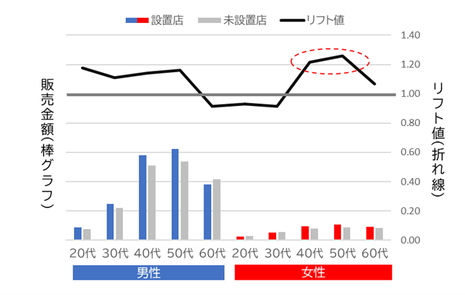 その結果、40代の男女に留まらず、ターゲット以外の50代女性でもPOSリフトがみられました。