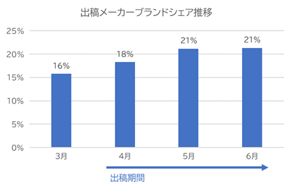 複数の時間帯で3ヶ月以上継続的に広告掲載されている某飲料のカテゴリーシェアを分析したところ、掲載前と比較すると約6%の向上。設置店舗と未設置店舗との比較においても、掲載前のシェアを100としたときに、設置店舗では5ポイント高い伸長率を示しています。