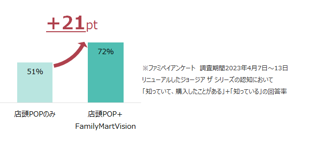 また、ファミペイアンケート調査において、ブランドリニューアルした「ジョージア」の認知度は、店頭POPのみを経由した認知率に対し、店頭POP+FamilyMartVision経由での認知度が21ポイント高いという結果となりました。アンケート調査結果からは、従来の店頭プロモーションにFamilyMartVisionが加わることにより、「ジョージア」のブランドリニューアルをより多くのお客さまに伝えられていることがわかりました。